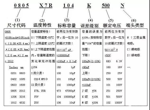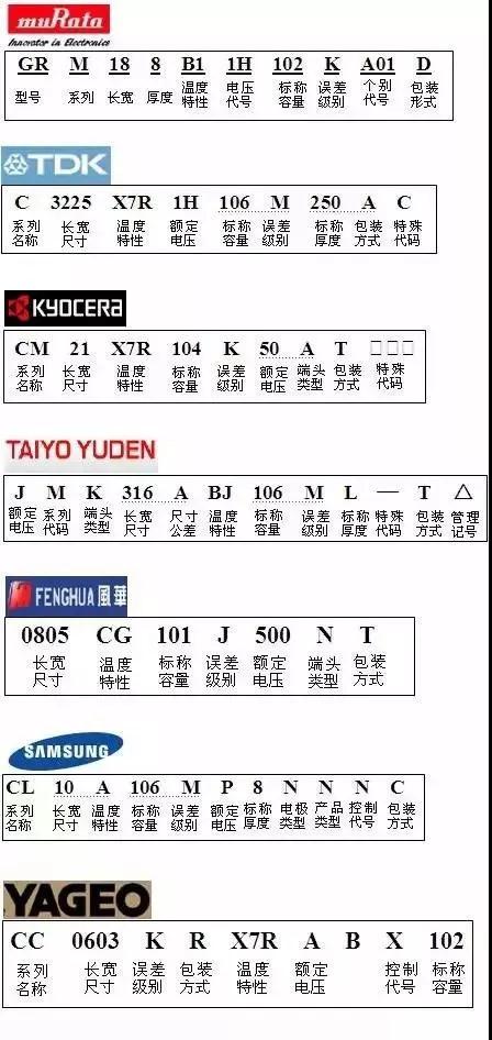 各制作商的產(chǎn)品規(guī)范命名規(guī)矩形式上不盡相同,但規(guī)范代號中基本上都包含:尺度、溫度特性、標稱容量、容量差錯等級、額外電壓和包裝方法等信息。