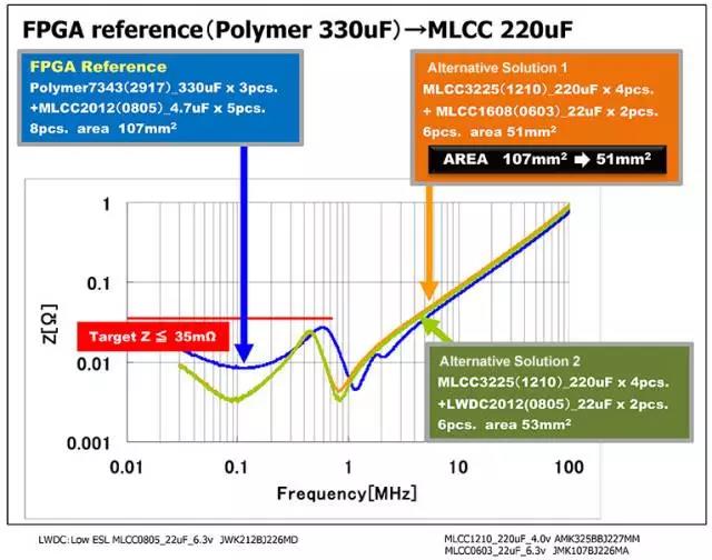 太陽誘電為進(jìn)入這樣的市場、100μF以上的超大容量多層陶瓷電容器與電解電容器相同、均采用E6步驟(100、150、220、330、470、680、1000μF)進(jìn)行開發(fā)。下圖是通過對FPGA的基準(zhǔn)結(jié)構(gòu)(Polymer+MLCC)實(shí)施全瓷化提出的縮小搭載空間的建議示例。