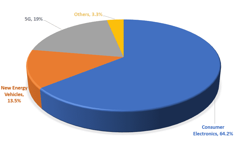 MLCC可用于各種應(yīng)用,如消費(fèi)電子、汽車(chē)、5G、工業(yè)、物聯(lián)網(wǎng)和軍事應(yīng)用。消費(fèi)電子占MLCC的最大份額,占市場(chǎng)的64.2%;其他驅(qū)動(dòng)力將是新能源汽車(chē)(包括電動(dòng)汽車(chē))和5G基站。